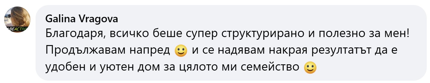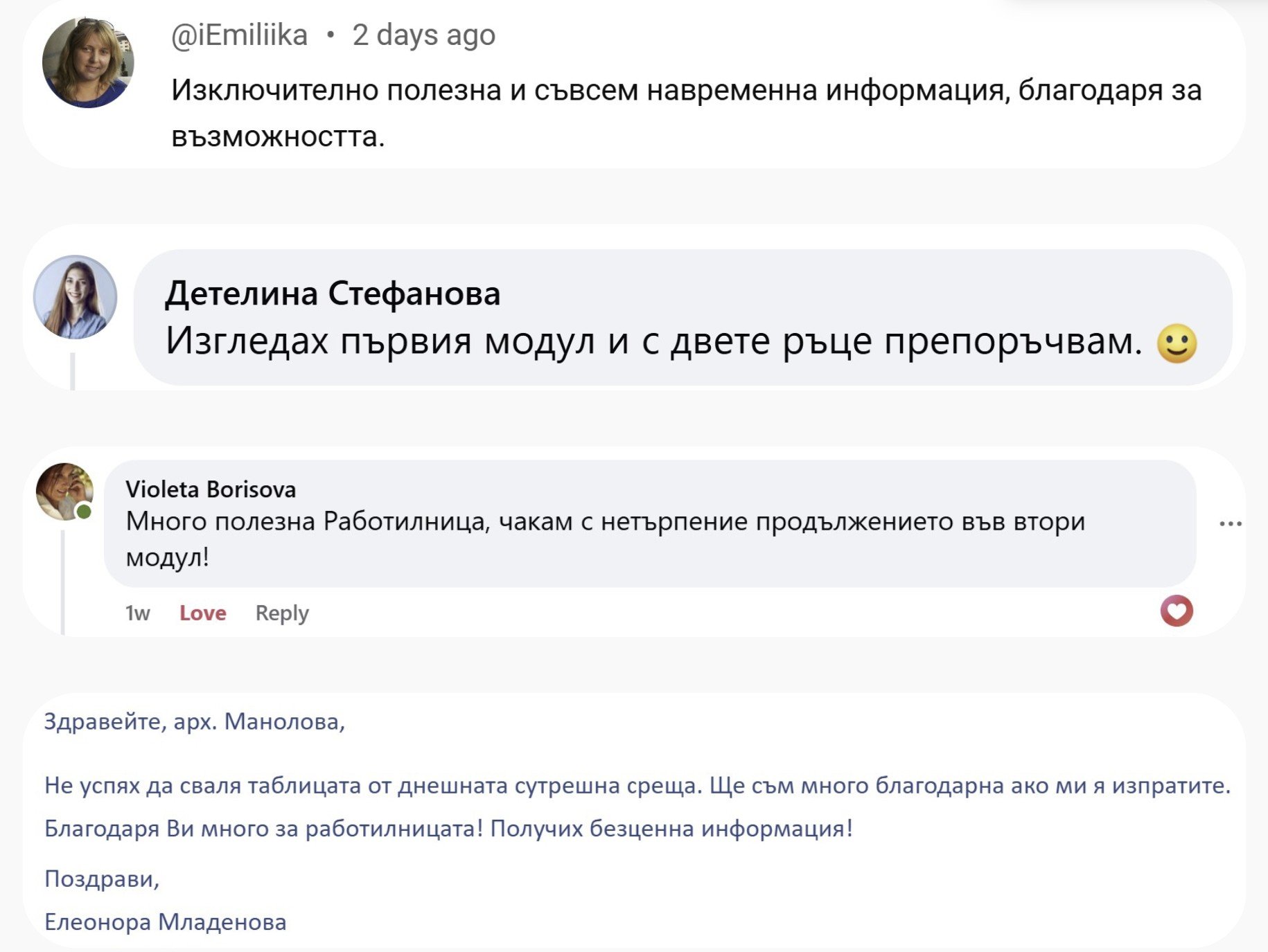 Общувахме с лекота и получихме отговори на всеки въпрос, който сме имали. Бърза и адекватна обратна връзка. Не ни бяха натрапвани конкретни фирми, производители, марки, хора за работа, което за нас беше плюс. Получихме ценна информация какво да избягваме и към какво да се стремим.